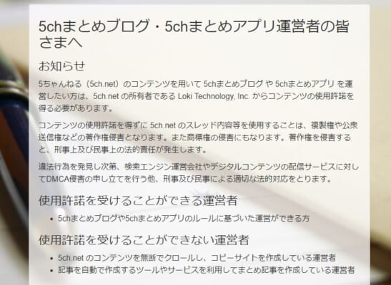 このように5ch側も「転載には許可が必要である」と公表していますので、まとめサイトを作るなら事前の許可申請が必要です。