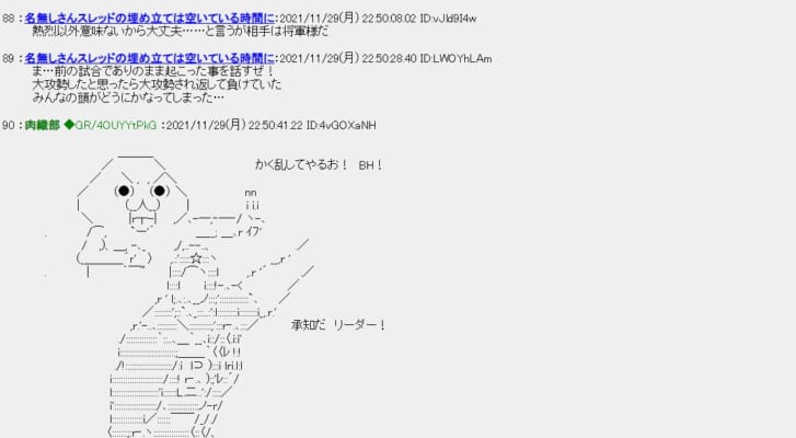 5chでは通常の文字によるレスや画像以外にも、こうしたアスキーアートを使ってスレッドを盛り上げることがあります。