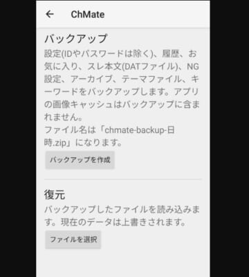 ChMateでは自分がお気に入りに追加したスレッド・履歴化されたスレッド・NG設定などをバックアップデータとして保存し、それを別のデバイスで復元することが可能です。
