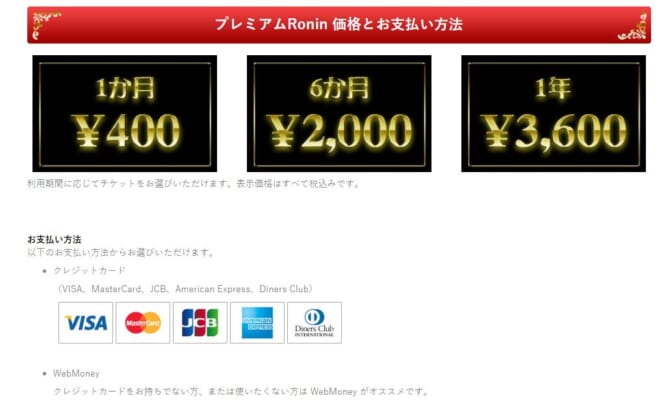 浪人は1ヶ月から購入することが可能で、支払い方法としてはクレジットカードもしくはWebMoneyが選べます。